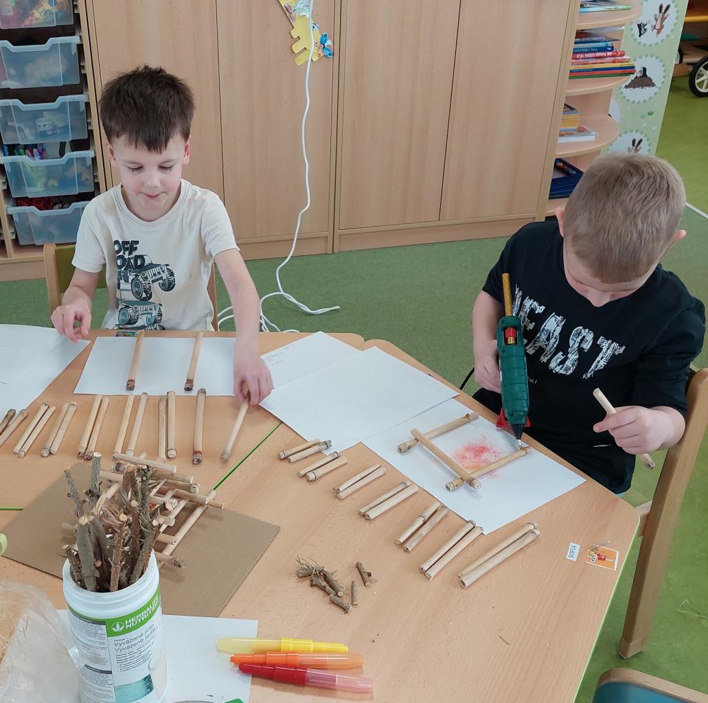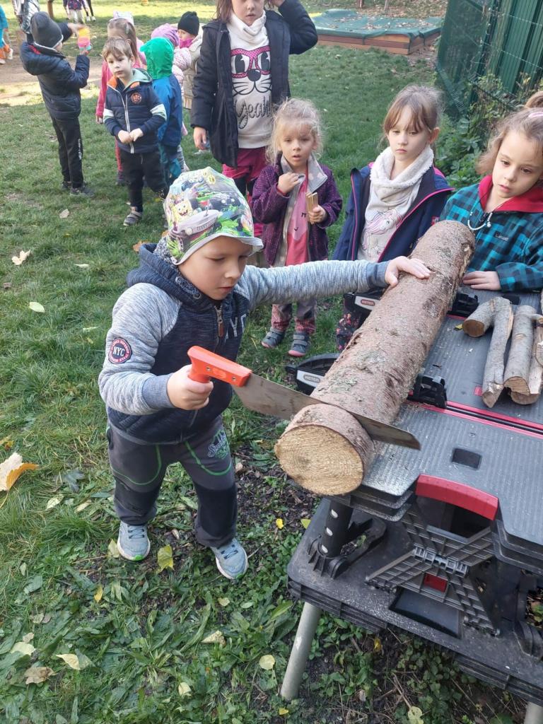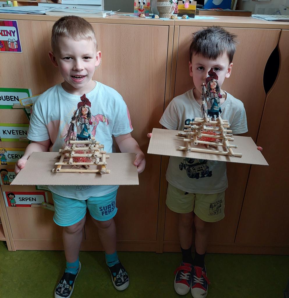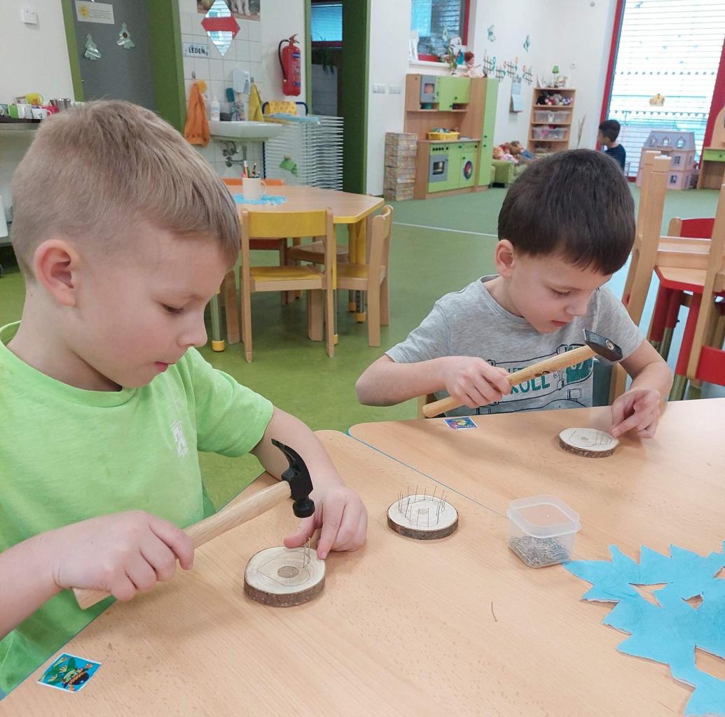 Děti v projektu Techniká MŠ pracují během pobytu venku i odpoledních činností se dřevem a různým přírodním materiálem. Řežou, zatloukají, stříhají, lepí, zdobí a pracují s tavnou pistolí. Výrobky si většinou odnesou domů, některé s louží k výzdobě školy.