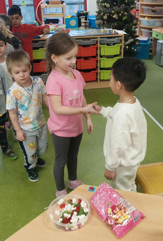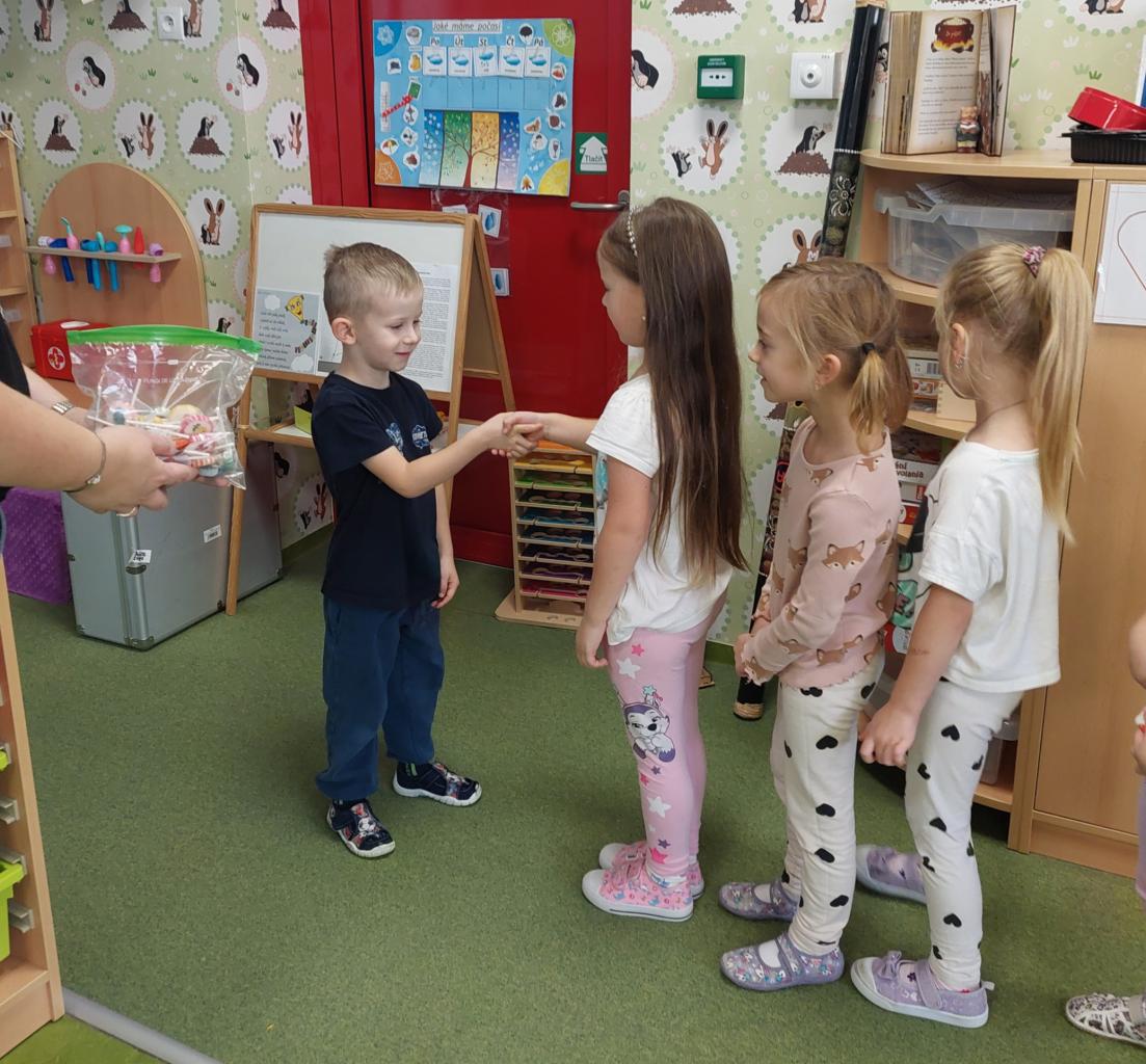 Některé děti slaví své narozeniny s kamarády ve třídě. Přinesou sladké překvapení, někteří i dárky nebo dort. Děti se tak učí, jak správně popřát k narozeninám.