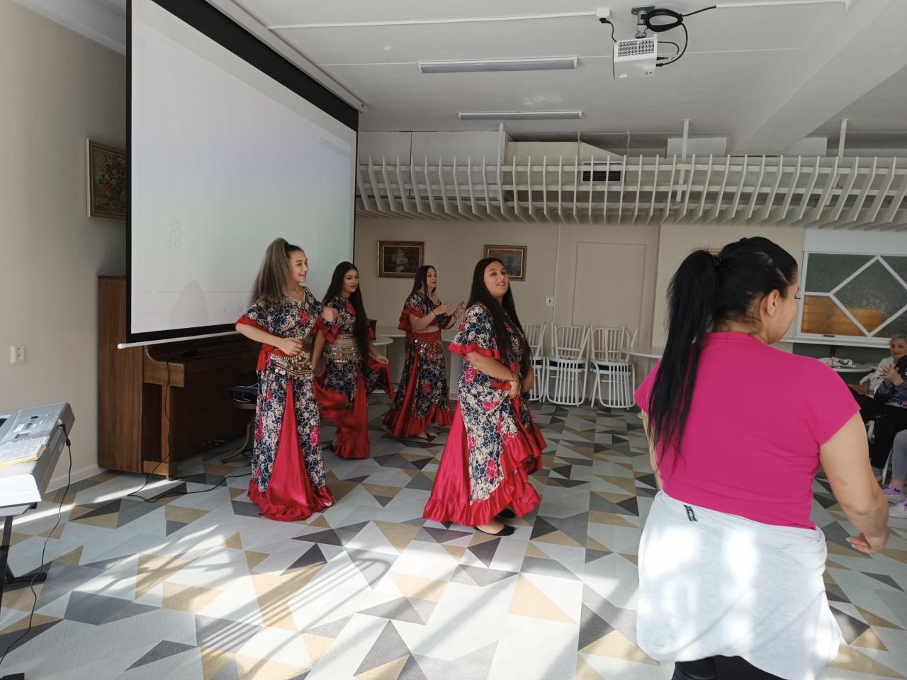 Tanečnice naši školy pod vedením p.učitelky Jany Šmardové a za klavírního doprovodu p.učitele Mgr.Roberta Šariského, v krásných tradičních rómských kostýmech roztleskaly přítomné diváky z řad seniorů v sále.